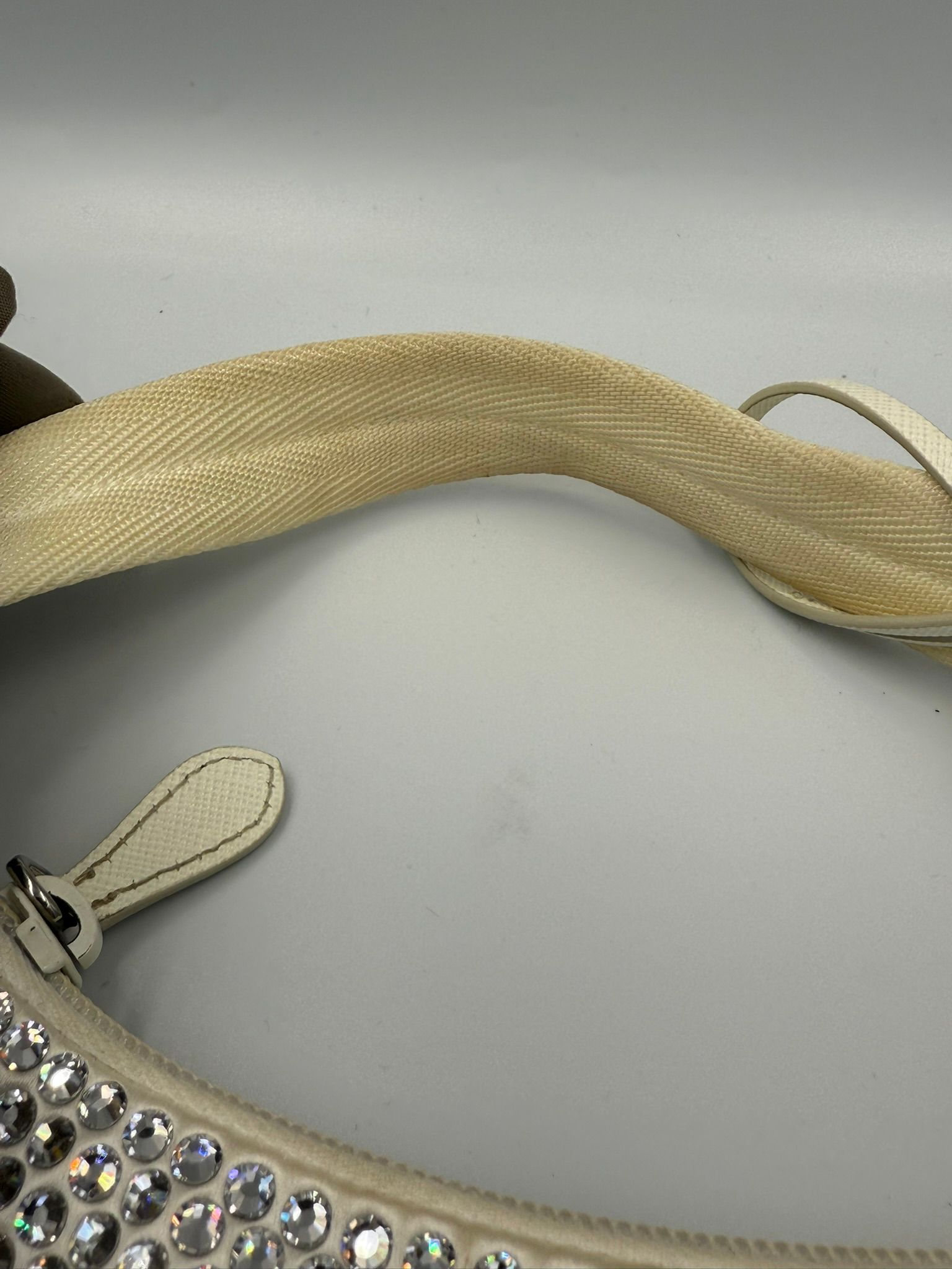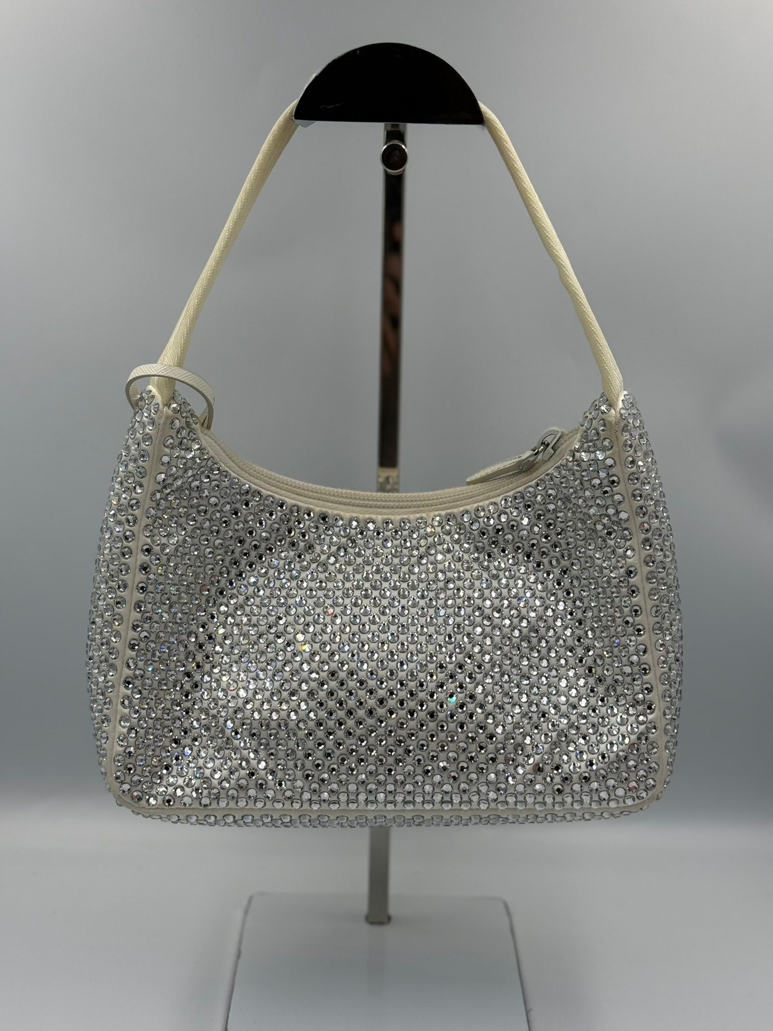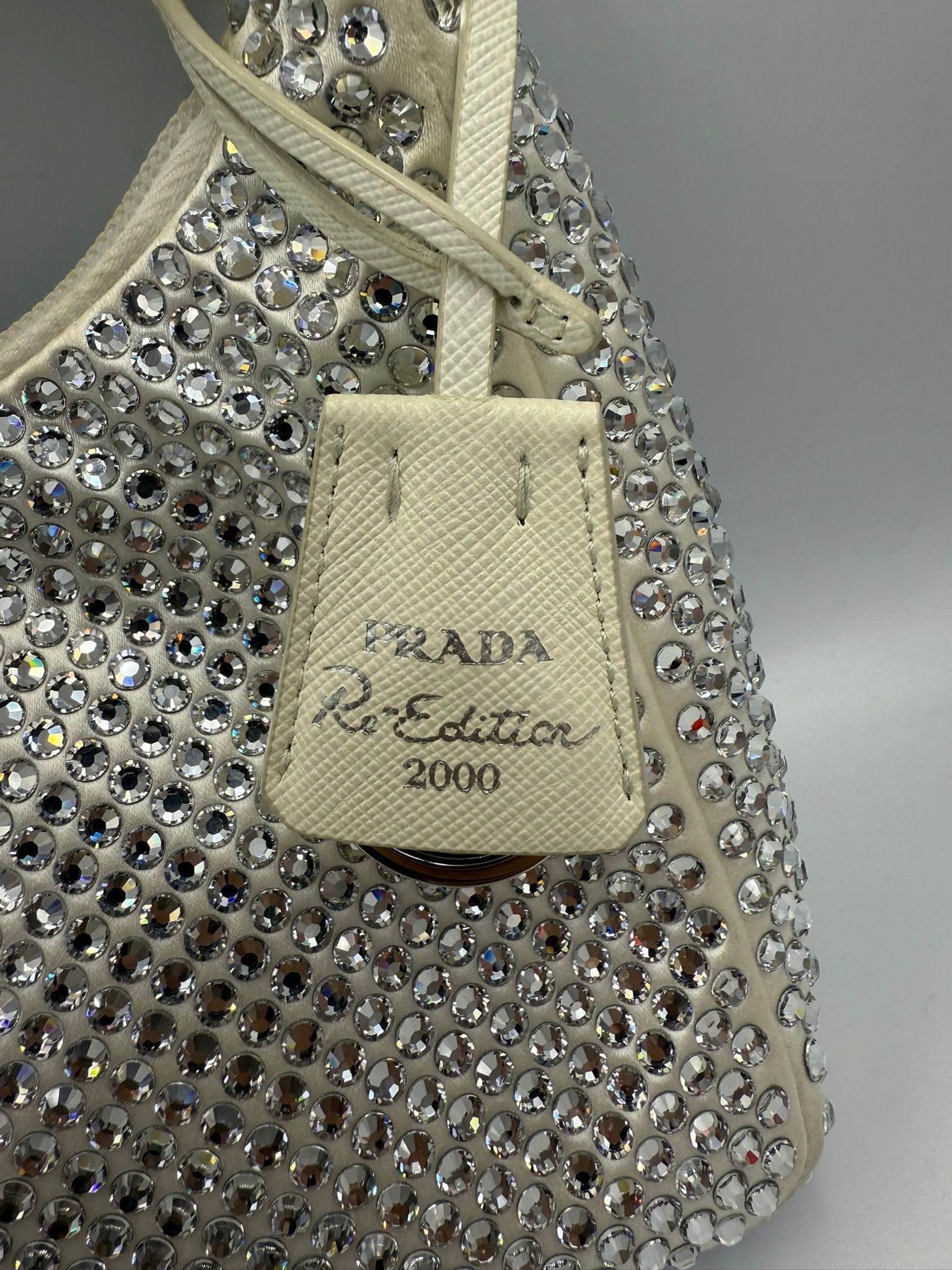 • Material – White Raso with leather & crystal accents