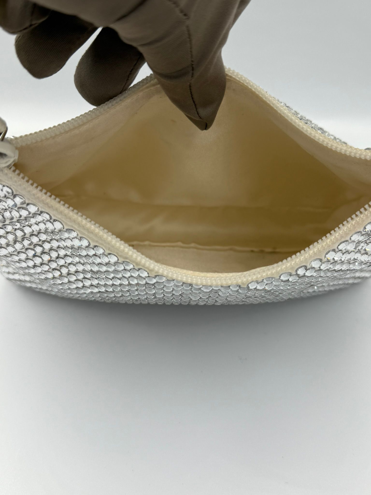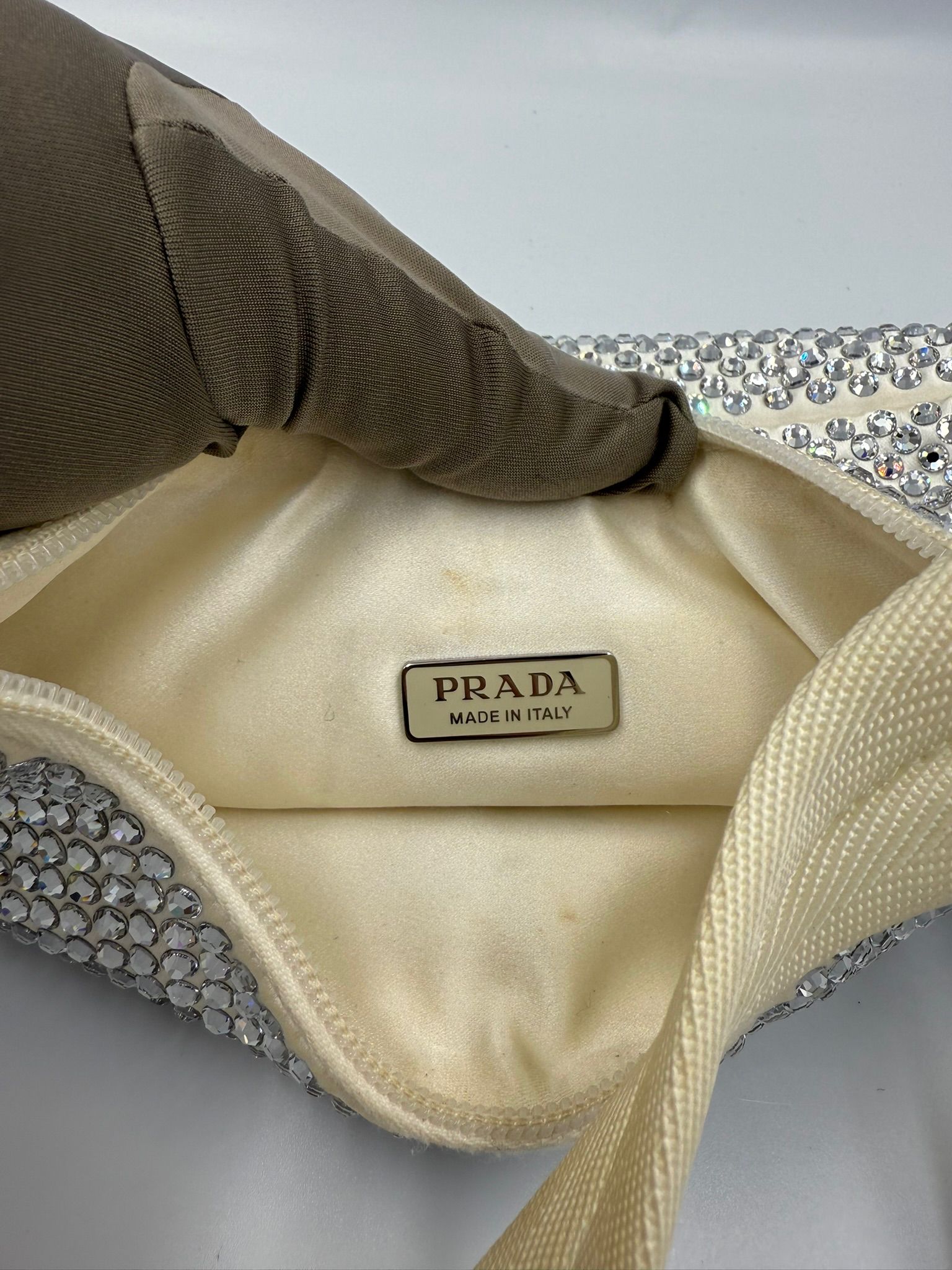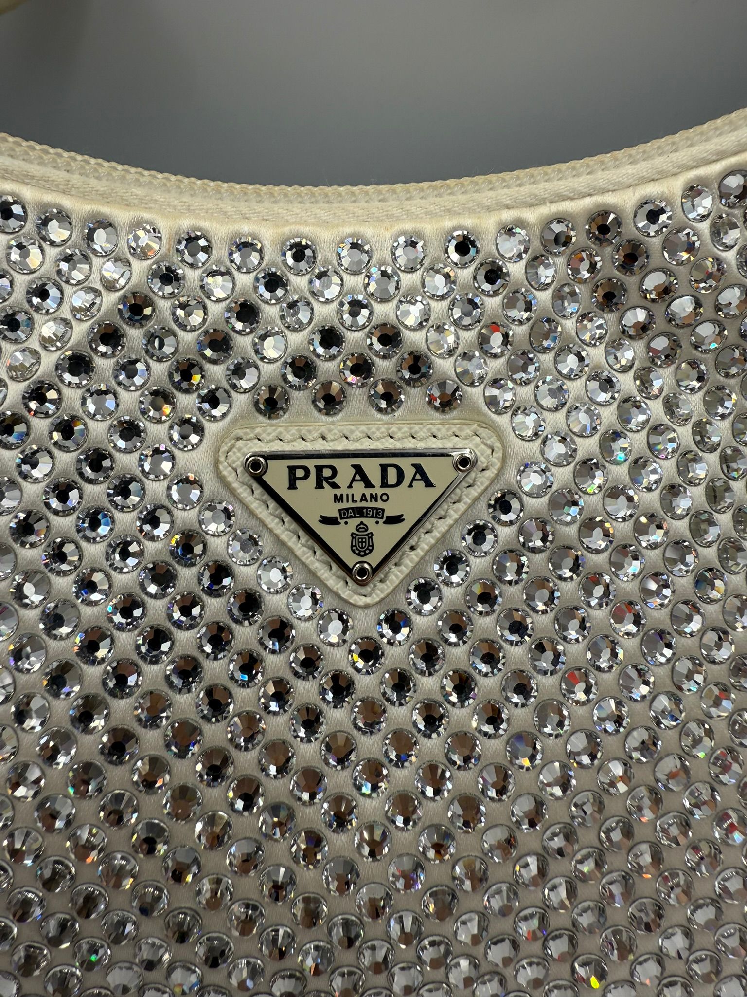 • Material – White Raso with leather & crystal accents
